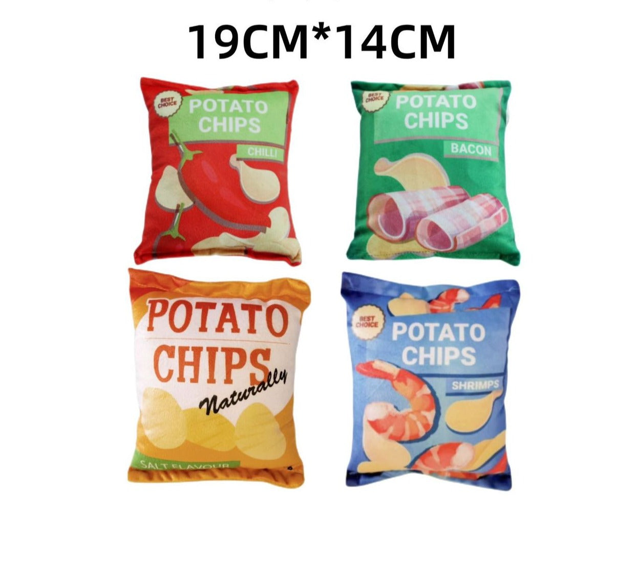 Let your dog dive into the crunchy, crinkly fun of our Crunchy Chip Bag Dog Toy Set! This set includes four vibrant toys, each designed to look like a different flavor of potato chips, adding a burst of color and excitement to your pup's playtime. Made from durable materials with a special crinkle feature, these toys mimic the sound of a real chip bag, providing sensory enjoyment and encouraging playful behavior. Perfect for fetching, tugging, and satisfying the natural chewing instinct, these chip bag toys are a delightful treat for your dog, minus the calories! Invite your furry friend to a playful "snack" session where the fun never ends!